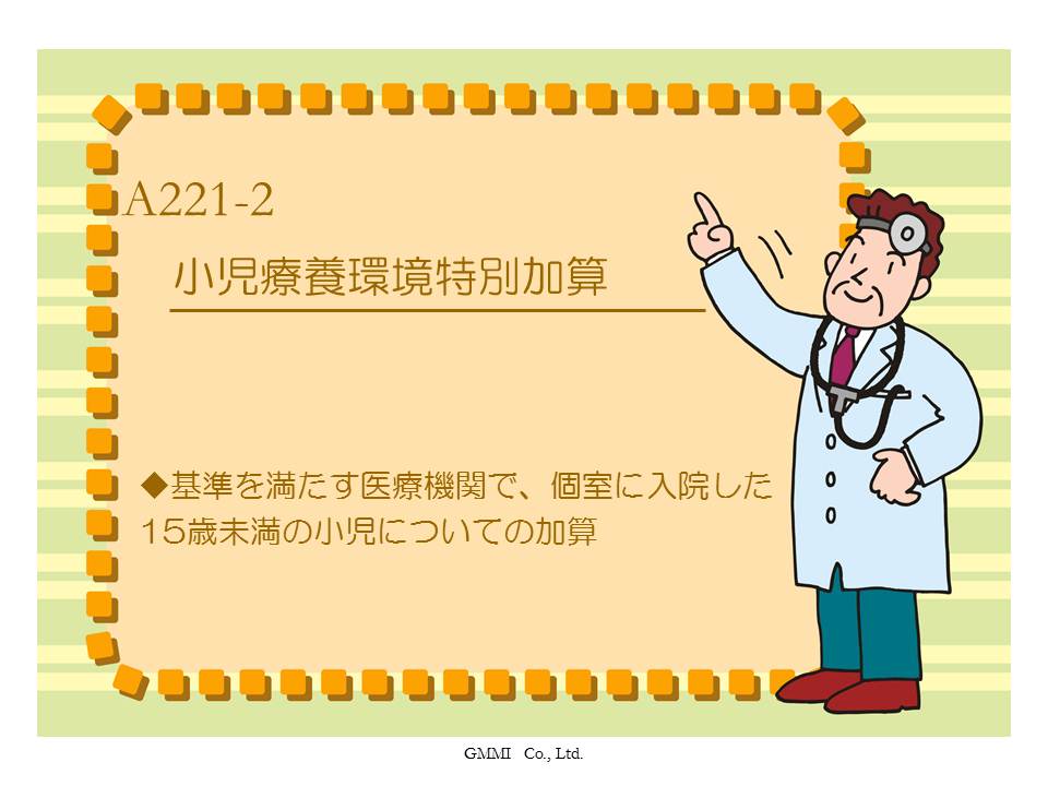 A221-2 小児療養環境特別加算は、小児患者で「麻疹等」、「感染症罹患の危険性が高い患者」が個室管理された場合に算定可能である。 この加算には「屋内禁煙」が施設要件として追加されている。 最近、「屋内禁煙」を追加している診療報酬項目が増えており、屋内禁煙が保たれていないと、複数の診療報酬項目の算定が不可となる場合もあるので、注意が必要である。